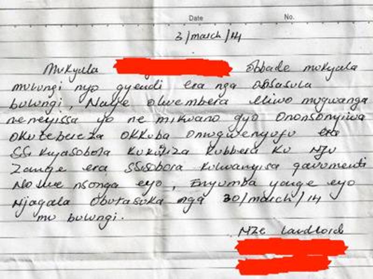 "You have been a wonderful woman as well as a tenant who hasn't given me any trouble over rent whatsoever," wrote the landlord in Lugandan, according to a translation by Ugandan LGBT blog SebaSpace. "But due to what is going on in the country [regarding the anti-gay law] and your way you and your friends behave, I am sorry but I think you are a depraved person who I can no longer tolerate in my house. I also cannot fight against the government. For that reason, I want you out of my house by March 30, 2014, peacefully."