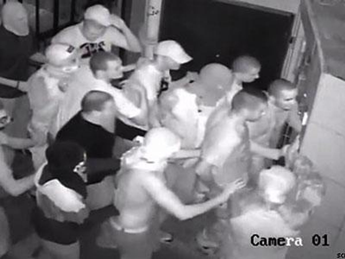 Though not a police action, it was a violent raid when a group of roughly 20 neo-Nazis tried to force their way into a gay club in Kiev, Ukraine, on a Monday evening last month. Security camera footage obtained by U.K. LGBT site Pink News caught the attack on video.