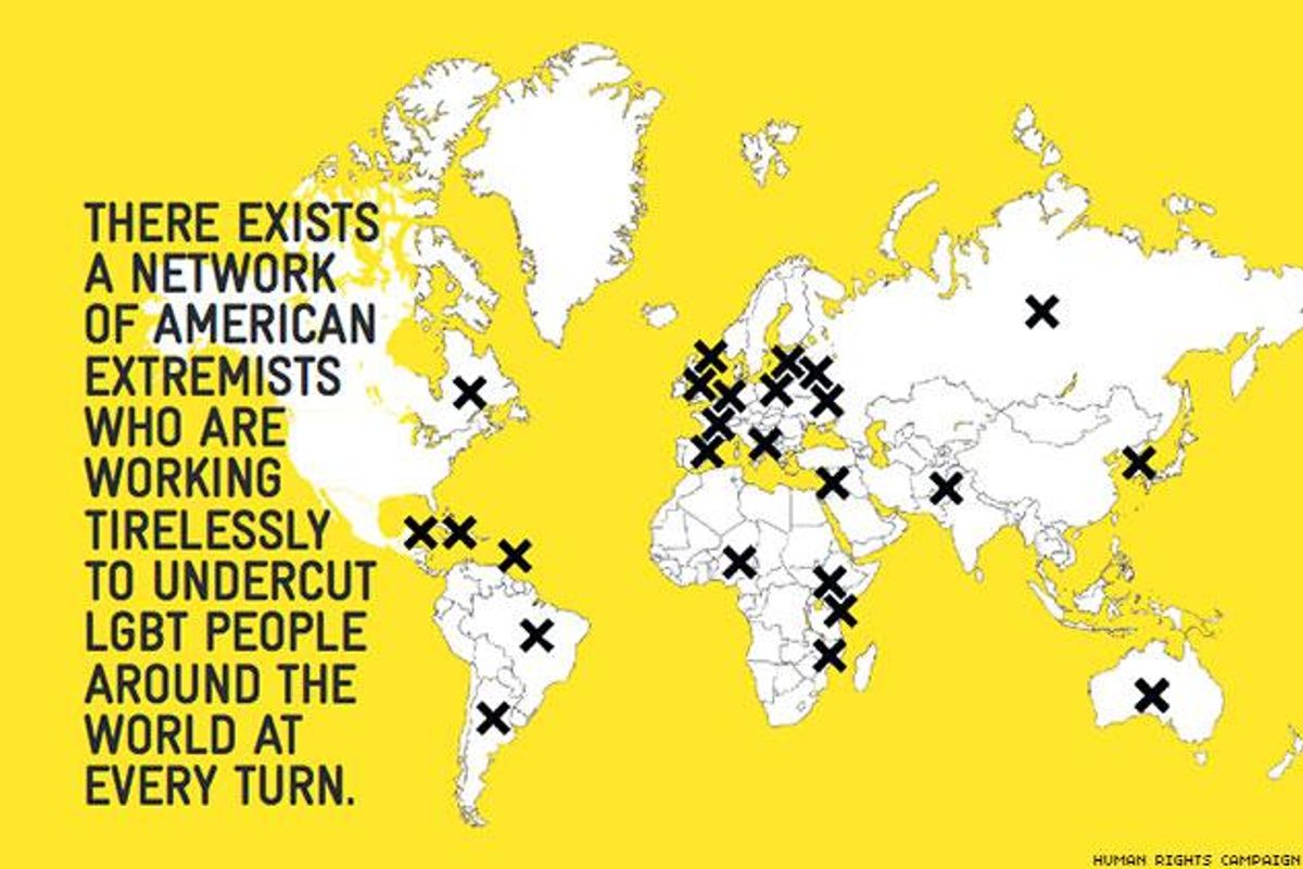 "Hate is not an American value, and we must expose and fight these individuals and their extremist allies," said Ty Cobb, the HRC Foundation's director of global engagement. "This is a destructive group of activists spreading anti-LGBT rhetoric, promoting laws that criminalize LGBT people, and seeking to restrict their speech and those who support them. Although their views may find little traction in the United States, public opinion in many other nations makes their words and global advocacy fundamentally dangerous."