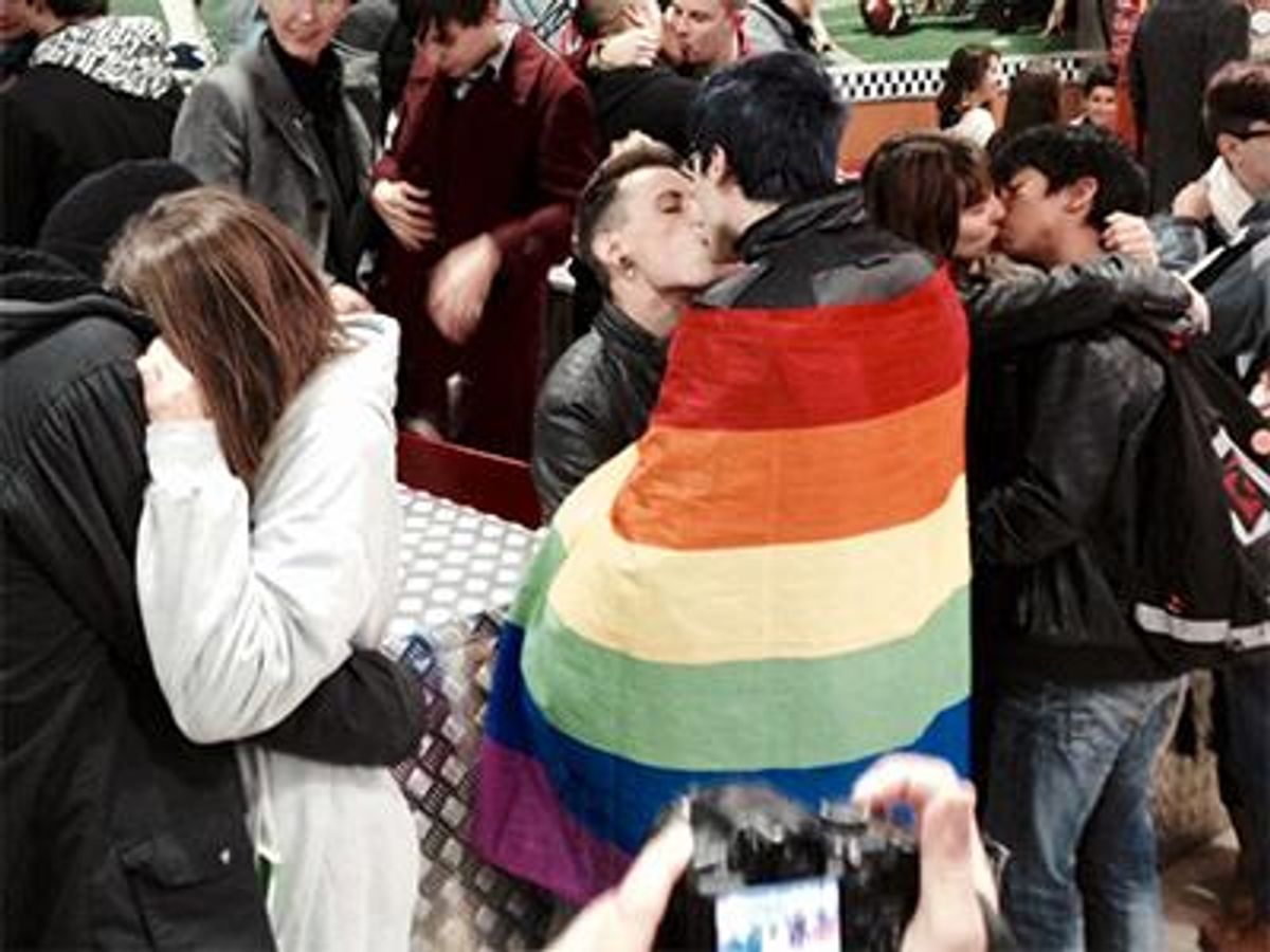 In response, an estimated 100 people, including at least a dozen same-sex couples, staged a kiss-in at the fast-food restaurant Saturday to protest the homophobic move, according to Huffington Post's Spanish site. Employees and guests inside the restaurant applauded during the demonstration.