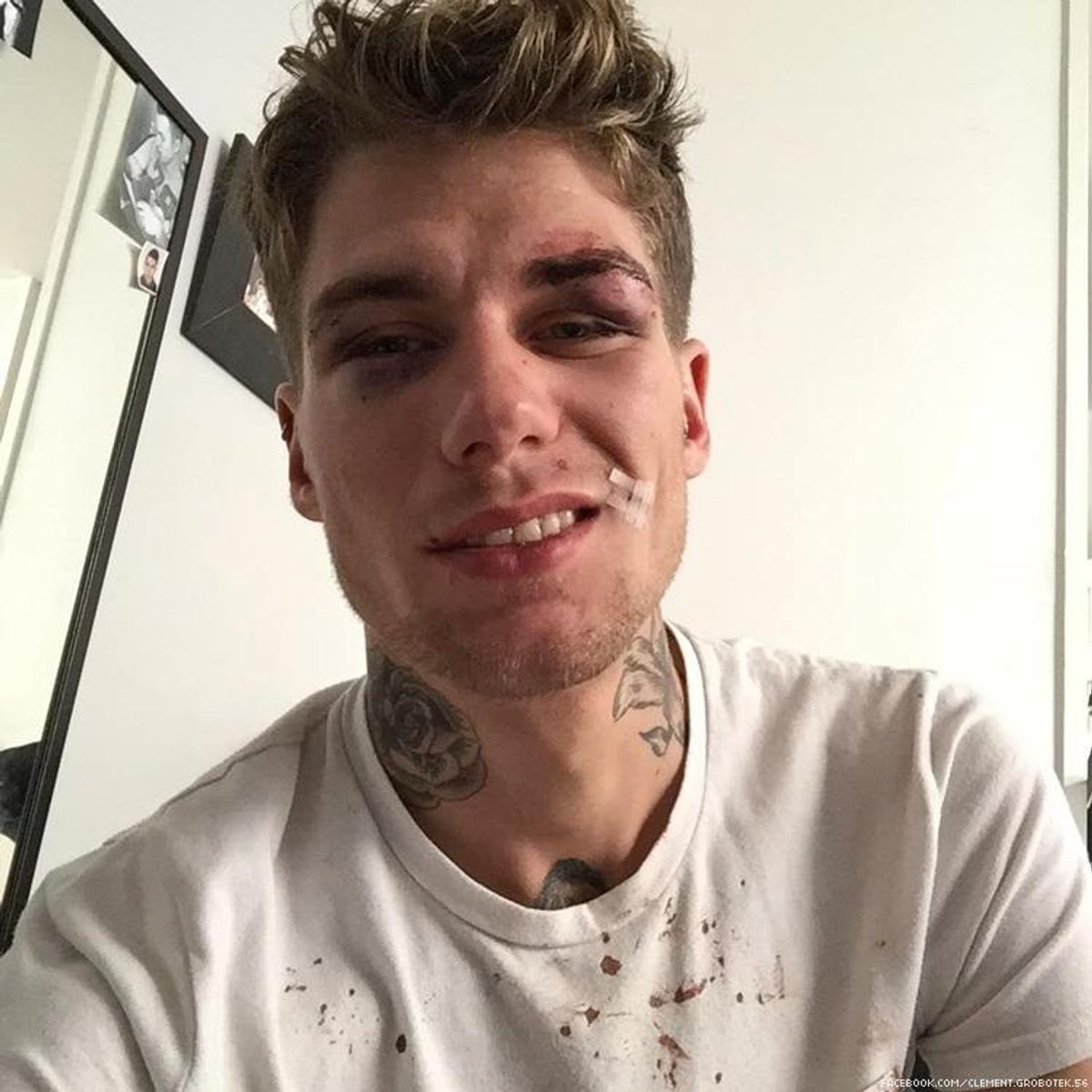 A selfie of Clement Grobotek of Montpellier, France, snapped after six people taunted him and his boyfriend with slurs, then viciously beat them, is going viral on the Internet.
