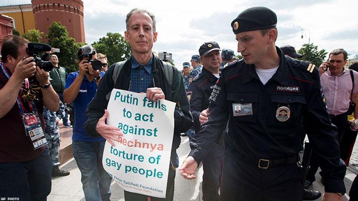 Peter Tatchell, a British citizen, was detained Thursday in Moscow, the first day of the 2018 FIFA World Cup, for speaking out against the Eastern European nation's inaction toward human rights abuses in Chechnya, a region of Russia.