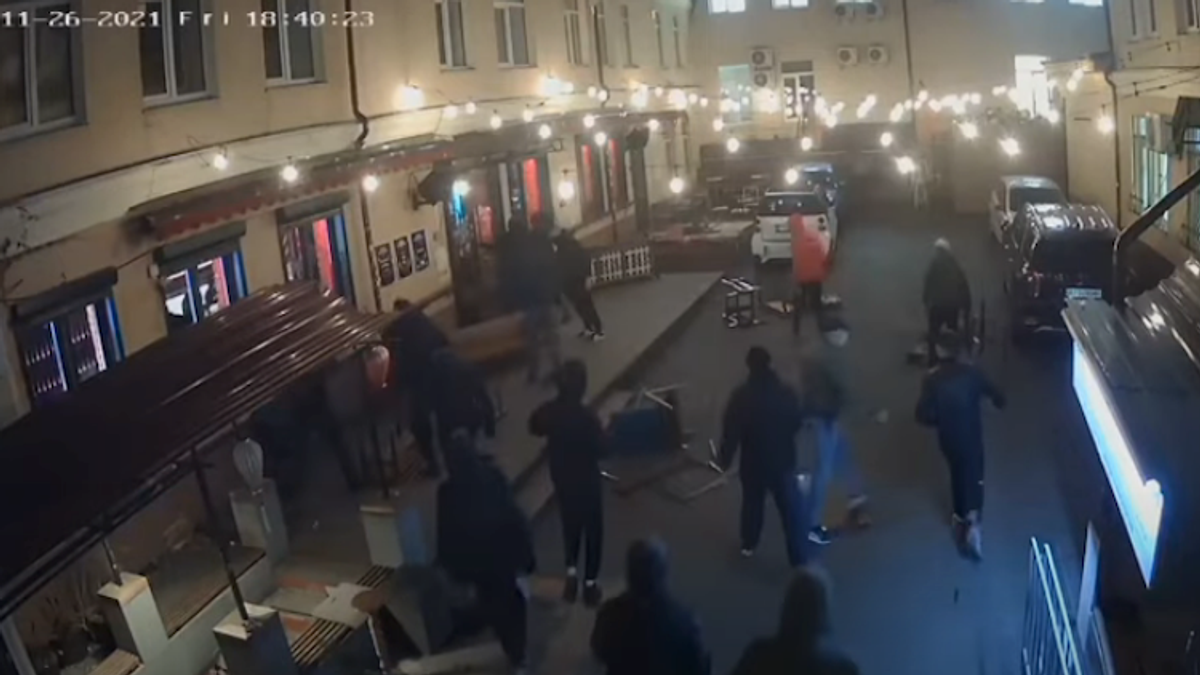 Camera footage posted on YouTube by the Kyiv Dispatch shows about 20 men in dark clothes in front of the bar as they attempt to make their way in, however, security guards are shown preventing them from doing so. The attackers instead trash the outside area.