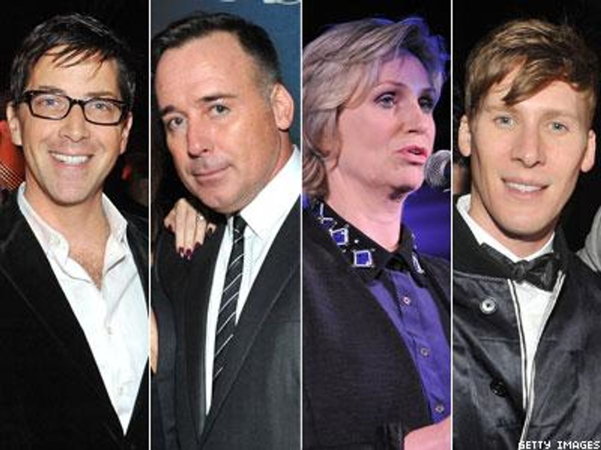 The party brought out a roster of LGBT stars to help combat homelessness, with several sharing personal testimonials from stage. From left: screenwriter Dustin Lance Black, writer and producer Dan Bucatinsky, L.A. Gay & Lesbian Center CEO Lorri Jean, and actress Jane Lynch.