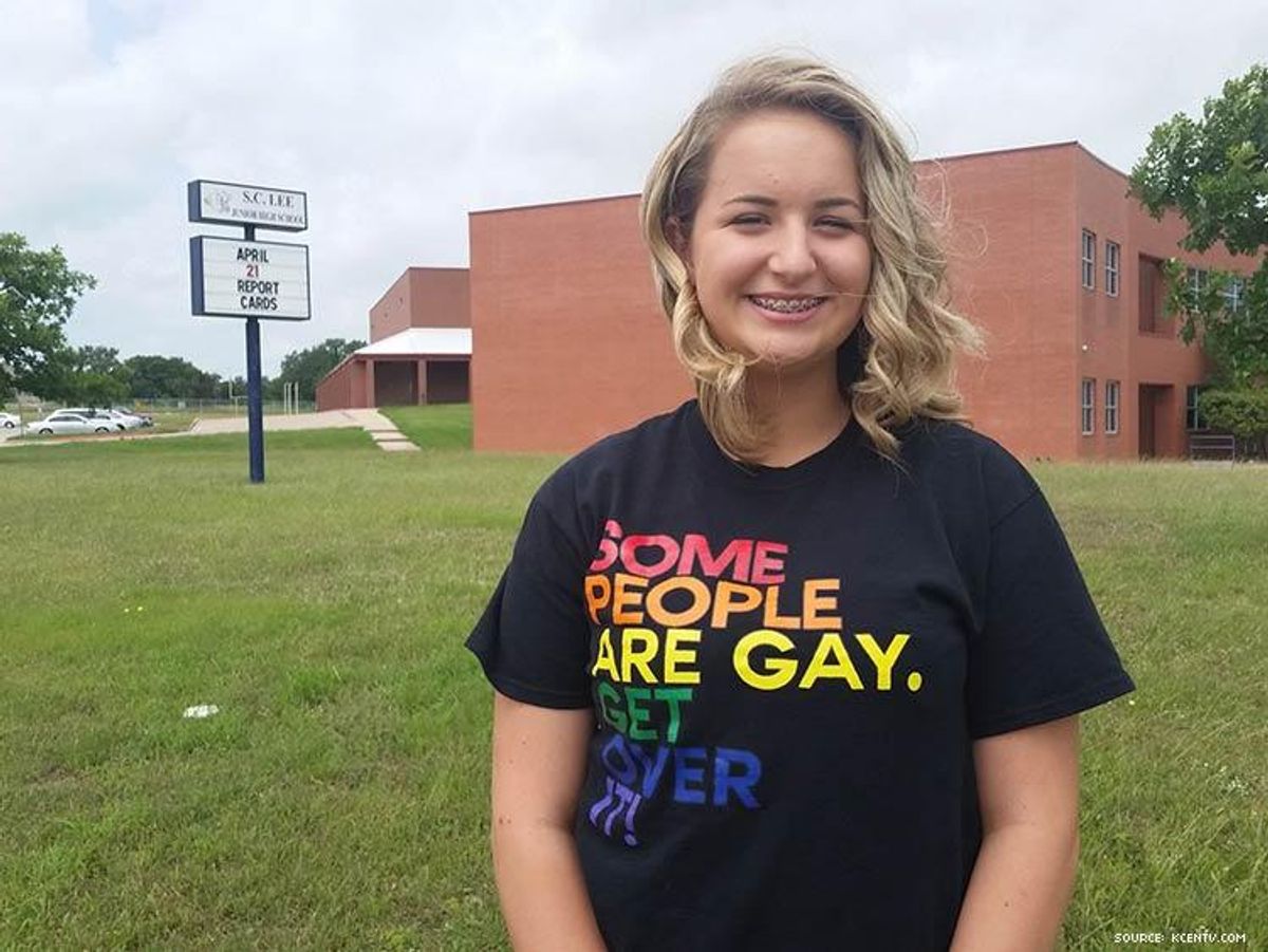 Shortly after arriving at S.C. Lee Junior High School in Copperas Cove Monday morning, Chaney was asked to go to the principal's office. Administrators told the student to change her shirt, but she refused. Cassie Watson, the student's mother, told Temple TV station KCEN that Chaney called her crying because "she felt school leaders were discriminating against her for being gay."