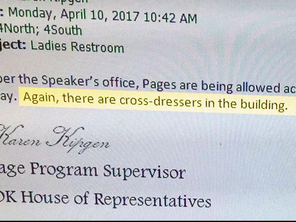 "As per the Speaker's office, Pages are being allowed access to the ladies restroom across from 401, for today," page supervisor Karen Kipgen wrote in a mass email. "Again, there are cross-dressers in the building."