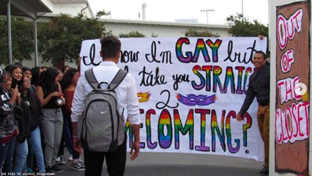 Standing behind a banner that read "I know I am gay but can I take you straight to homecoming," the gay student, Alexander Duarte, watched his friend Erick Pineda walk a gauntlet of cheering students toward him before Pineda agreed to be his date.